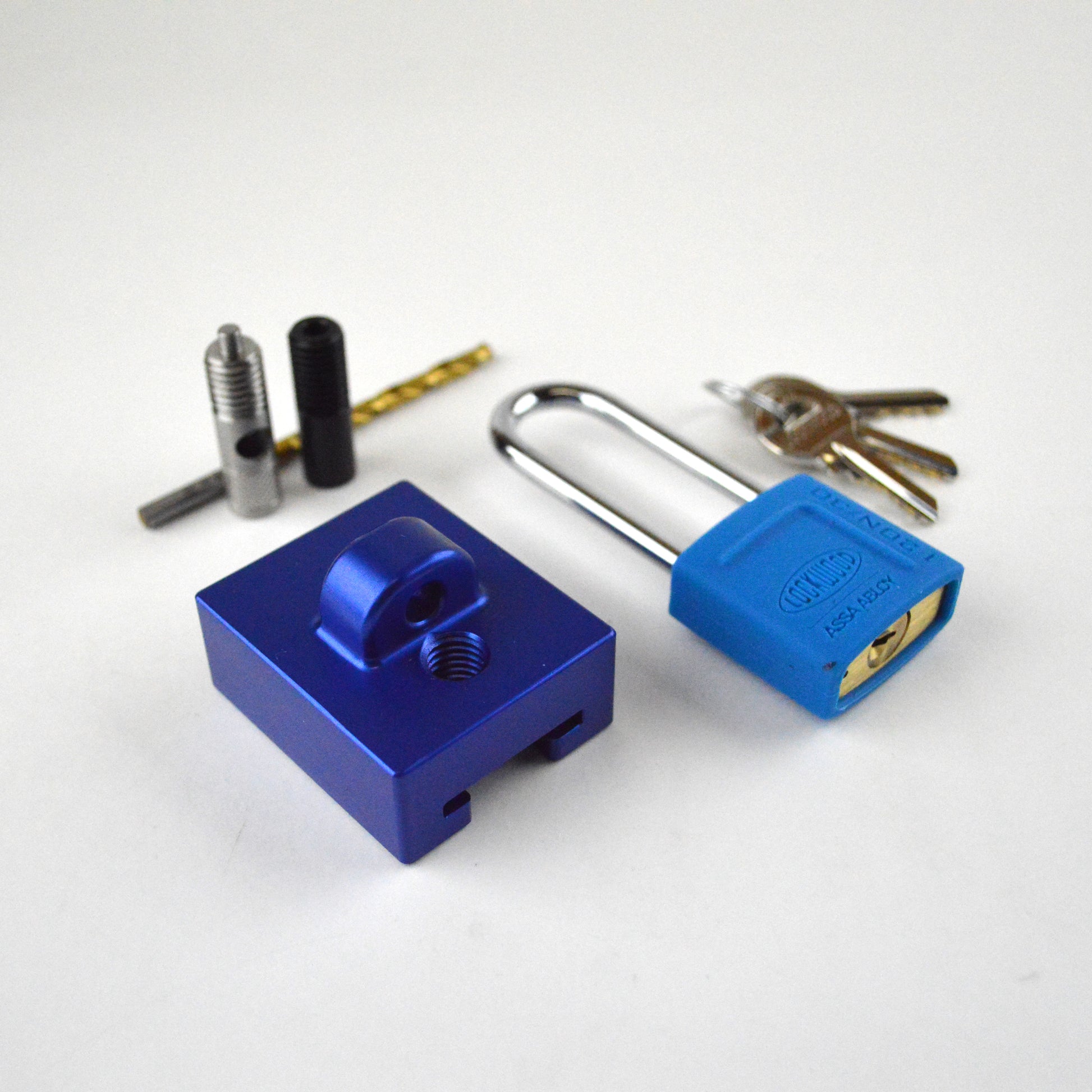 Billet-machined canopy lock blocks are super tough and will fit painted canopy rails without jamming. Features a stainless steel locking bolt with a 4mm pin to correspond with one or more holes drilled in the rail wherever you choose (fully closed or partially open). Supplied with an Acetal drilling guide and new 11/64" jobber drill for match drilling one or more holes in the canopy rail.